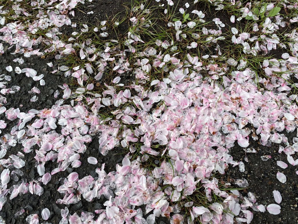 4月4日(日)の雨で河川敷の桜が散りはじめています。
