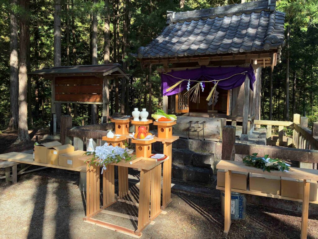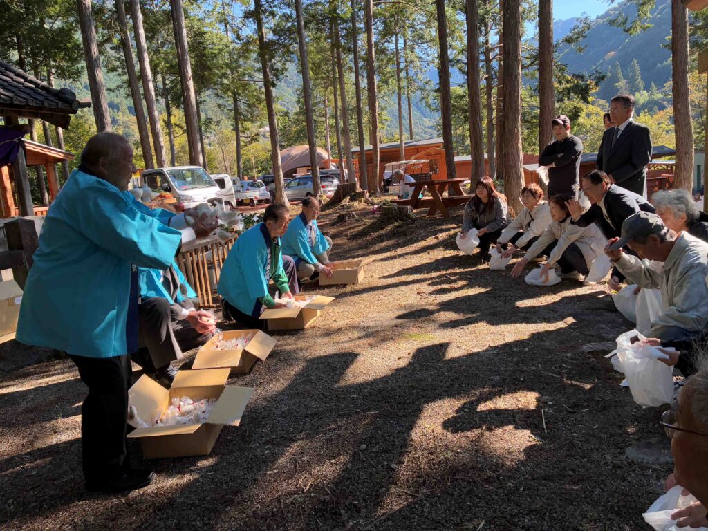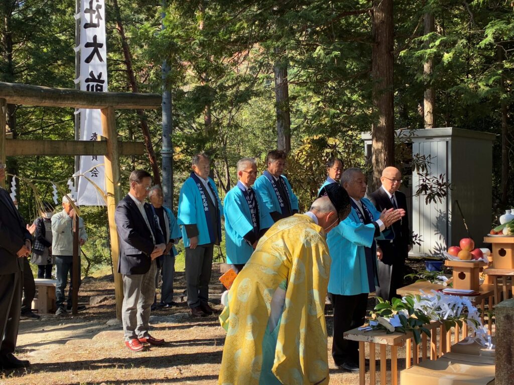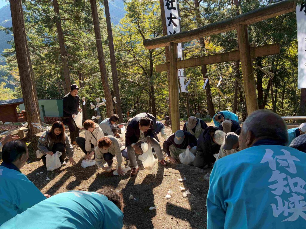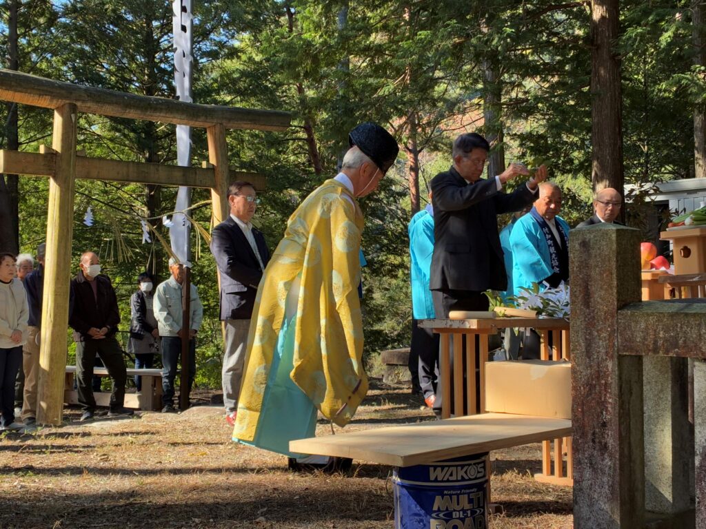 令和7年度 宮島神社祭⛩ 投稿日: 2025年10月23日 投稿者: 付知町観光協会 今年も晴天の中、付知峡『宮島神社祭』が執り行われました。 宮島神社は、源平合戦ゆかりの古戦場字付知峡宮島の戦いに於いて闘死した、源氏と平家の武勇を偲んで冥福を祈り、住民達が立てたヒノキの社殿で「骨牌地蔵尊」が安置されています。 年に一度、地元氏子総代を中心に付知町観光協会他関係者によって、神事を執り行います。