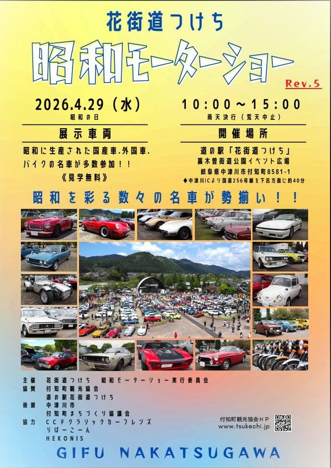 Rev.5『昭和モーターショー』開催🚘 投稿日: 2026年1月16日2026年1月16日 投稿者: 付知町観光協会 昭和を彩る数々の名車が勢揃い! 昭和に生産された国産車・外国車以外にバイクの名車も多数参加! 車大好きな人!あつまれ~ 今年も、「昭和モーターショー」が 道の駅花街道付知のイベント広場で開催されます。 例年通り4月29日(昭和の日)の祝日に開催予定です! ※イベントについてのお申込みやお問い合わせは、下記メールアドレスよりお願い致します。 実行委員会メールアドレス hanakaidou.tukechi.motorshow@gmail.com