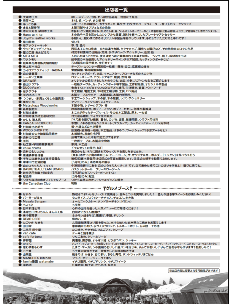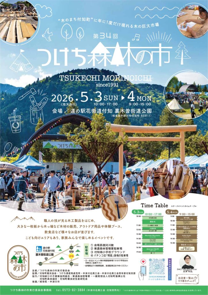 🌳2026年つけち森林の市🌳 投稿日: 2026年4月4日 投稿者: 付知町観光協会 付知町観光協会にもチラシが届きました! 出展者一覧も掲載されています。 最新情報は 【tsukechi.morinoichi】 インスタグラムをご覧ください。 お問合せは 【つけち森林の市実行委員会事務局】tel 0573-82-3884 へお願い致します。